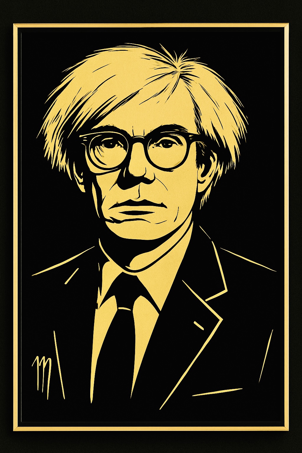 Andy Warhol by Manos Ioannidis appears here not as the king of colour, but as a sharp silhouette—stripped of celebrity gloss and frozen into iconic clarity. The engraving renders his face as if it were a logo, a brand, a mask. Yet behind the minimalism lies irony, detachment, and a quiet kind of revolt. This is not a man—it’s an image about images. A portrait of the artist as his own product.