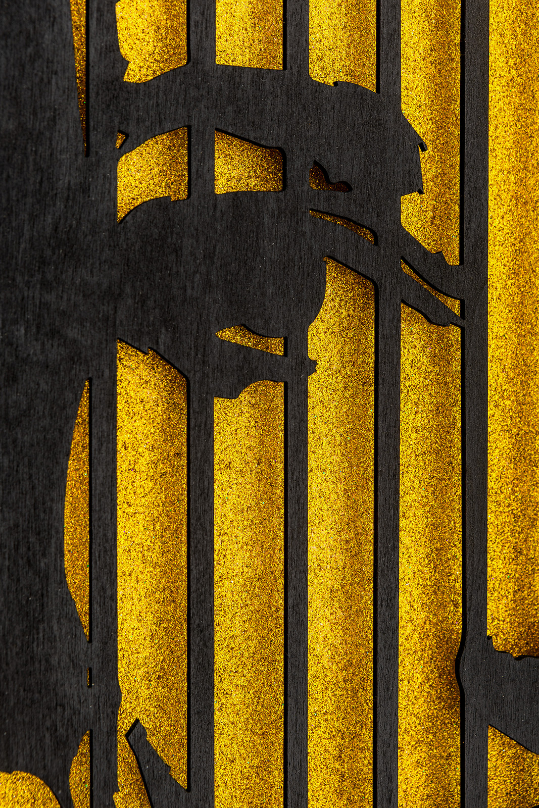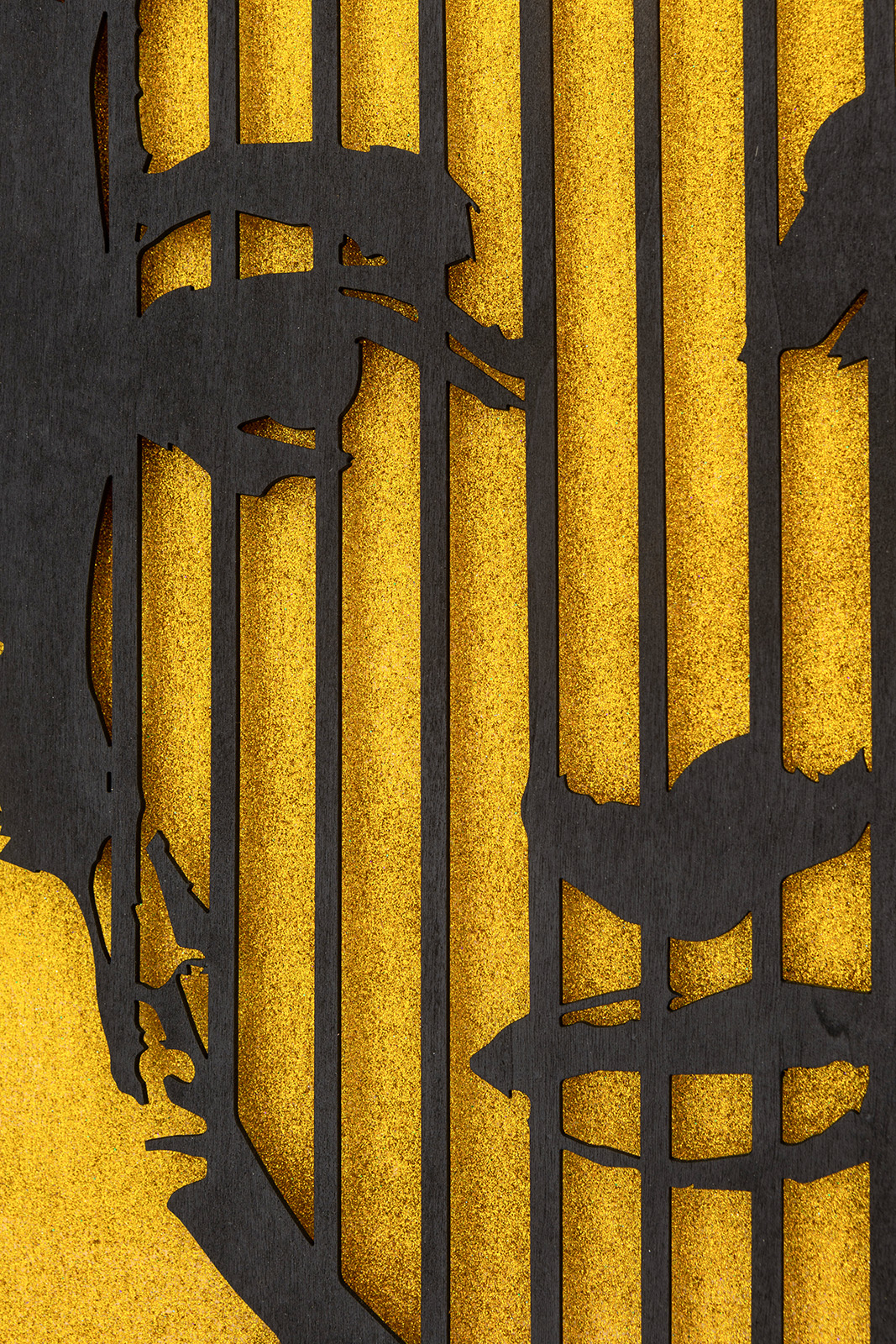 Medium: Carved Plywood Figure nailed on Gold-Glittered Plywood