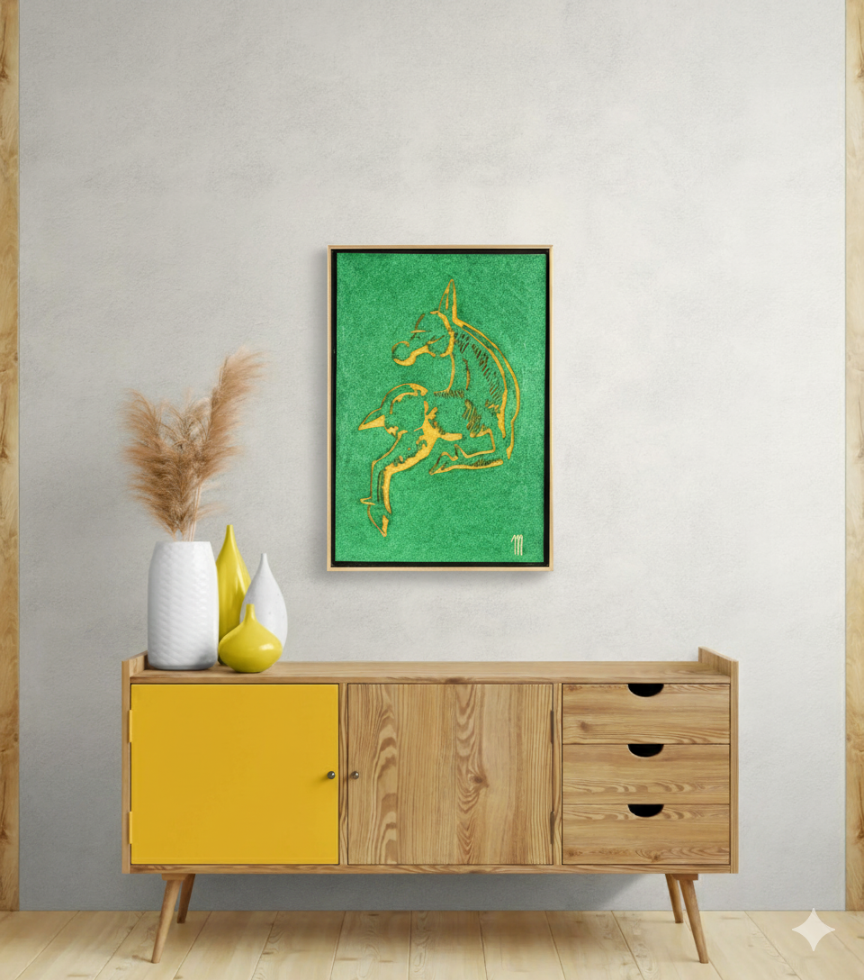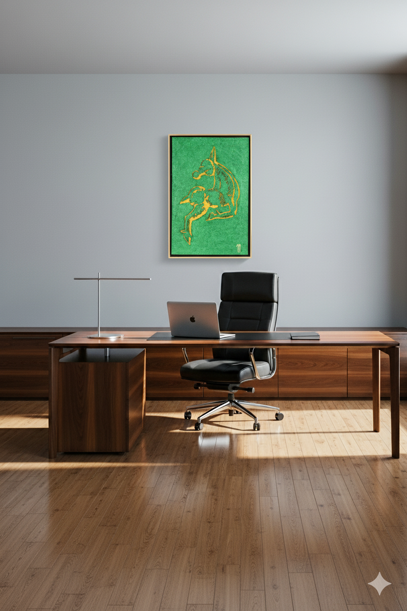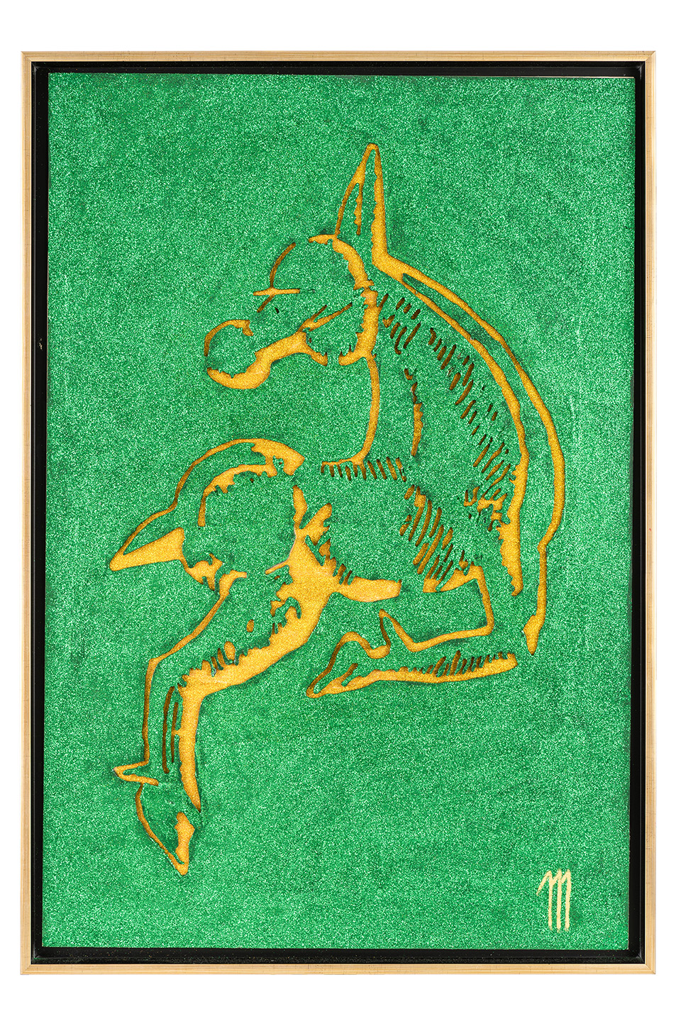 Aegean mythology returns here, not through narrative but through form. The Emerald Rider is carved into time — primitive, dreamlike, suspended in a space between cave art and cosmic symbol. The green glittered surface radiates vitality, while the golden incision functions like a sacred outline. This is not a horse and rider—it is a vision. A fragment of ancient memory reimagined with materials of the future.
