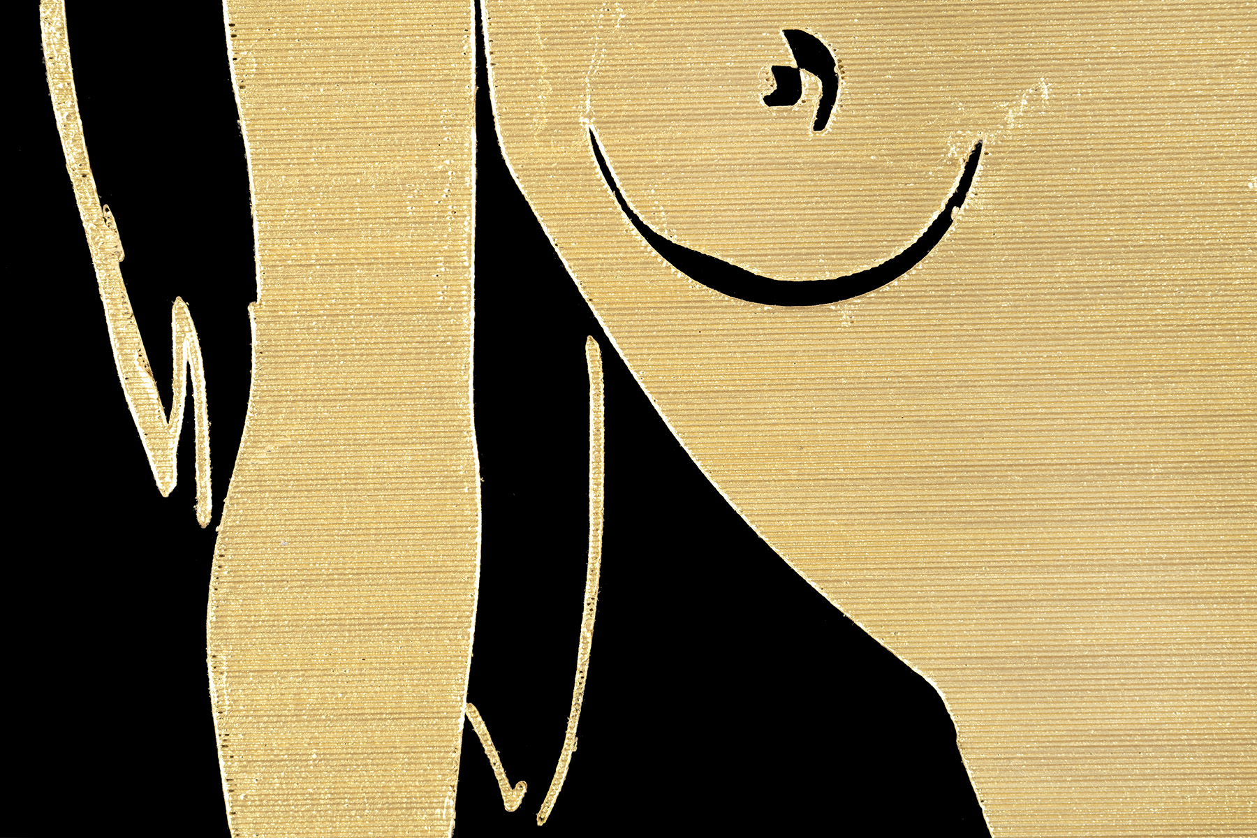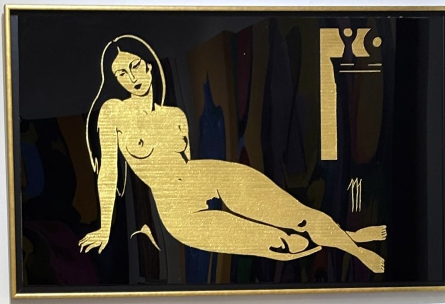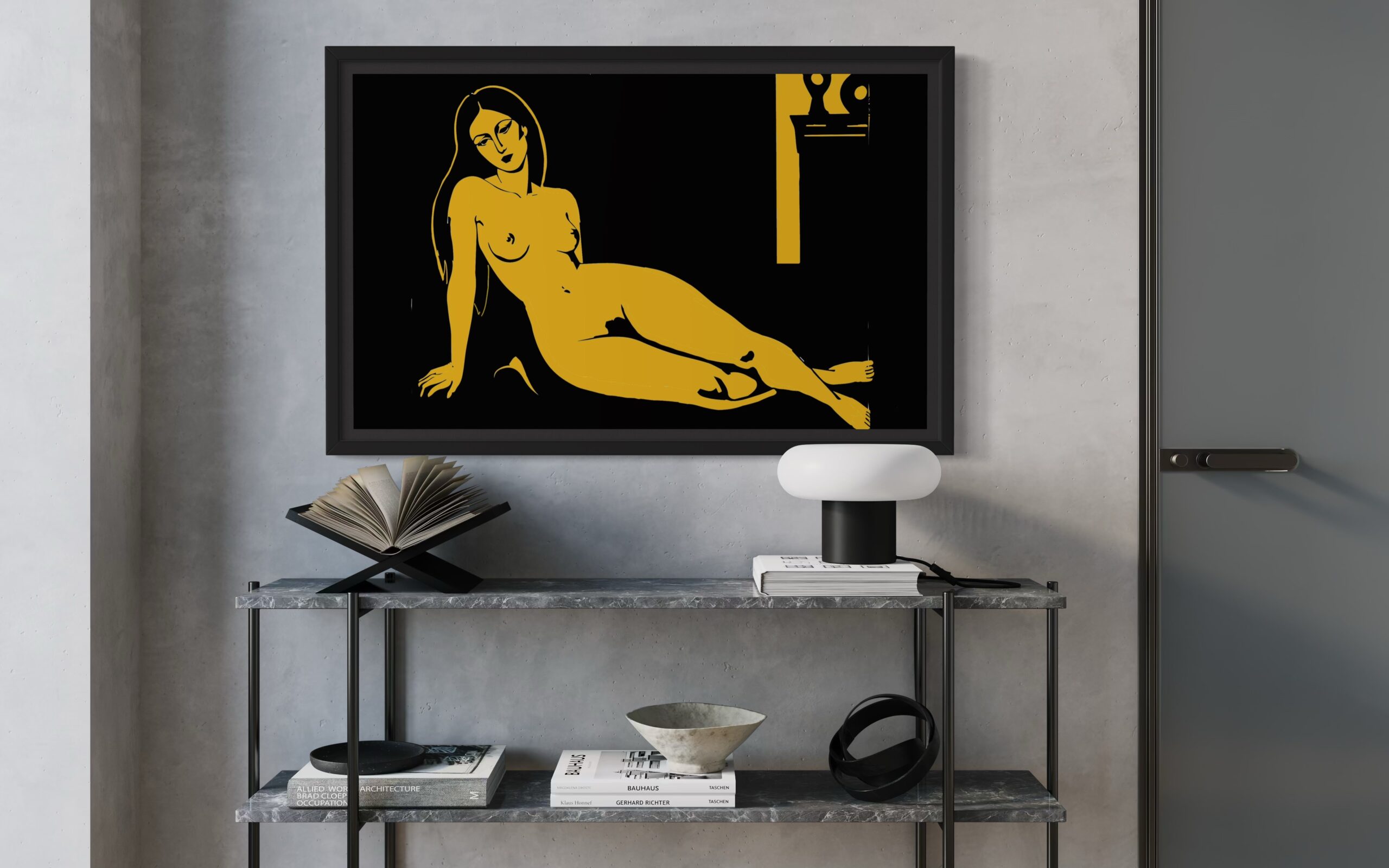 The nude body, cast in gold, rests upon absolute black like an ancient mural or a Byzantine memory. The austerity of the line highlights the essential, while the pose of the figure radiates confidence and calm. It is a work that speaks of the timelessness of form, of the endurance of beauty across time.